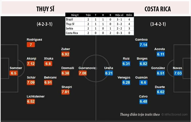 + Đối đầu: Hai lần đối đầu Thụy Sĩ thắng Costa Rica 2-0 năm 2006 và thua 0-1 năm 2010. Tám năm sau họ gặp lại với hai thái cực. Thụy Sĩ tràn trề cơ hội còn Costa Rica đã xác định đây là trận cuối và chỉ còn mang ý nghĩa danh dự.