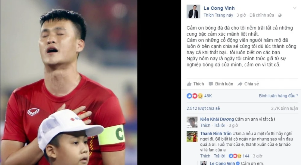 Cũng sau trận hòa với Indonesia, Công Vinh đã chính thức nói lời chia tay người hâm mộ. Anh chia sẻ trên trang cá nhân của mình rằng: