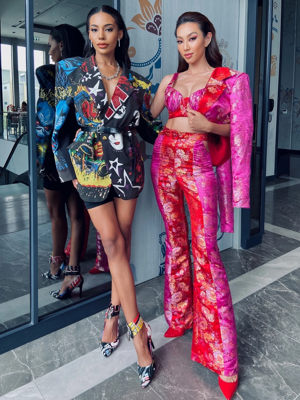 Tại khu vực phỏng vấn, Thùy Tiên vui vẻ thả dáng cùng Miss Grand Thailand. Đây cũng là một trong những đối thủ nặng ký của đại diện Việt Nam tại cuộc thi.