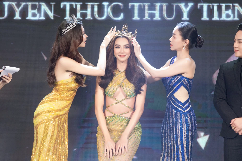 Thuỳ Tiên nhận vương miện từ bà Phạm Kim Dung và á hậu Ngọc Thảo.