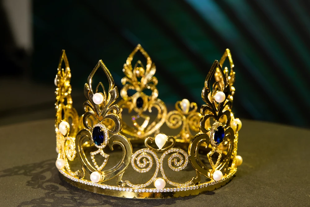 Chiếc vương miện danh giá có thiết kế vô cùng sang trọng và quý phái. Vật phẩm được chế tác bởi bạc nguyên khối mạ vàng.