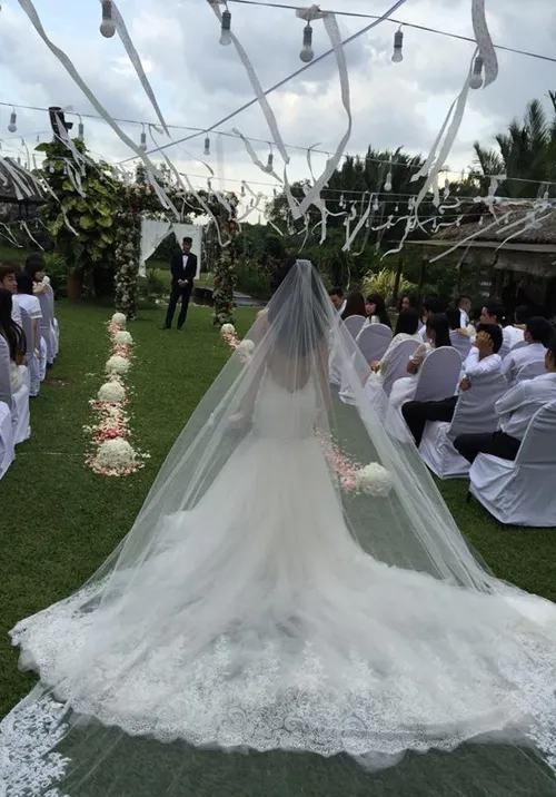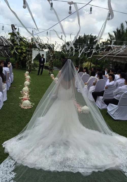 Cô kết hợp với khăn voan dài thêu ren đồng điệu với hoa văn trên váy.