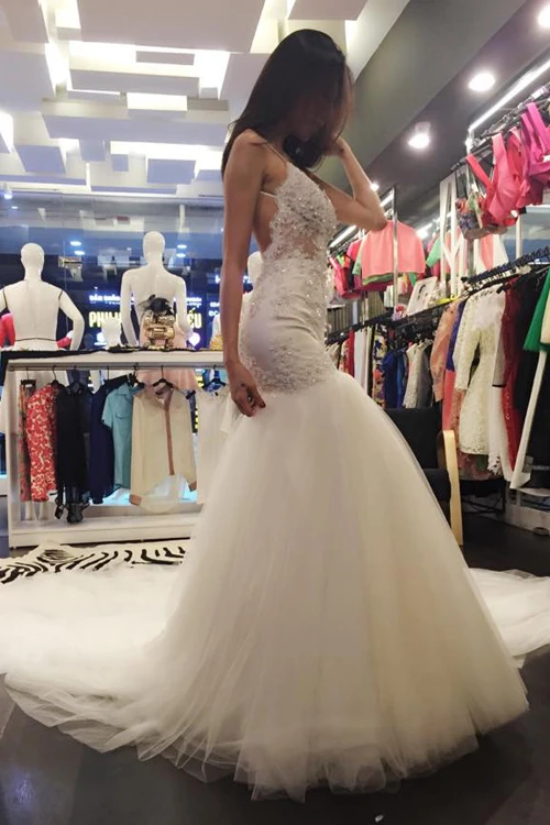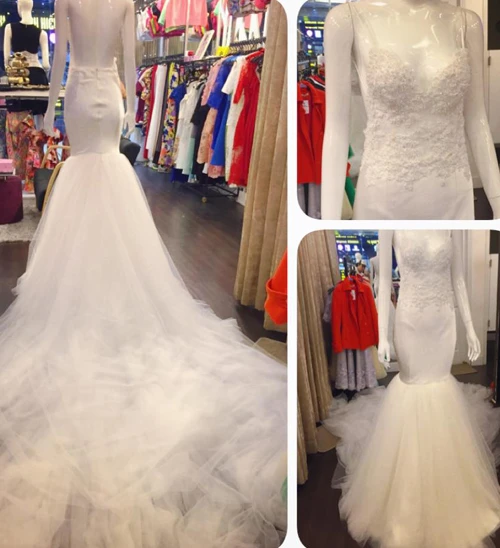 Váy cưới đuôi cá màu trắng đáp ren hoa và đá pha lê Swarovski Thủy Tiên sẽ mặc trong hôn lễ sắp tới.