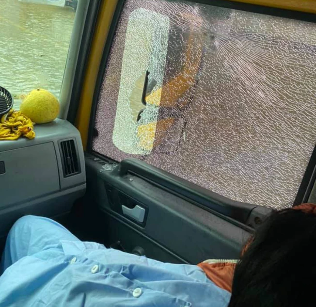 Xe cứu trợ của Hòa Minzy bị ném đá vỡ kính. Ảnh: FBCN
