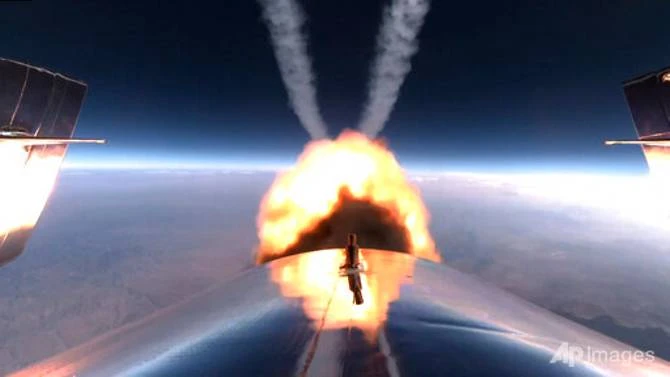 Động cơ tên lửa của tàu VSS Unity bốc cháy ở rìa vũ trụ vào ngày 11-7. Ảnh: AP