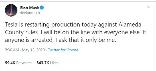 Ngày 11-5, Giám đốc điều hành Tesla Motor - tỉ phú Elon Musk nói ông sẽ mở cửa trở lại nhà máy sản xuất ở bang California (Mỹ) và sẵn sàng “bị bắt” nếu có vi phạm lệnh duy trì phong tỏa để ngăn COVID-19 từ chính quyền địa phương, theo hãng tin Reuters.