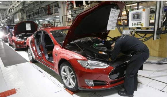 Công nhân của Tesla tại dây chuyền sản xuất xe điện Model S. Ảnh tư liệu: AP