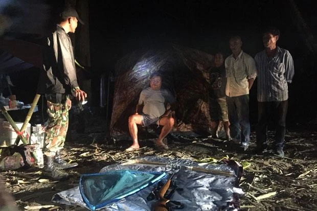 Lực lượng kiểm lâm kiểm tra ông Premchai Karnasuta (ngồi) cùng ba nhân viên khác tại khu bảo tồn Thungyai Naresuan. Ảnh: BANGKOK POST