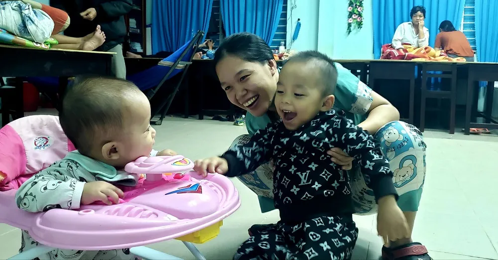 Bé Minh Khang (9 tuổi) vui vẻ chơi đùa cùng mẹ và anh trai. Chị Trần Thị Mỹ Hương (27 tuổi) cho hay, ngay từ sáng sớm, gia đình chị đã được phường đón đến điểm di dời tập trung để đảm bảo an toàn. Đây cũng là lần thứ 3, cậu bé Minh Khang cùng gia đình "chạy bão" chỉ trong thời gian ngắn. Ảnh: T.AN