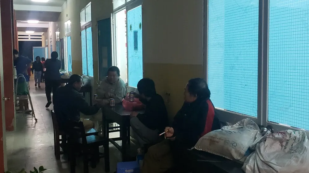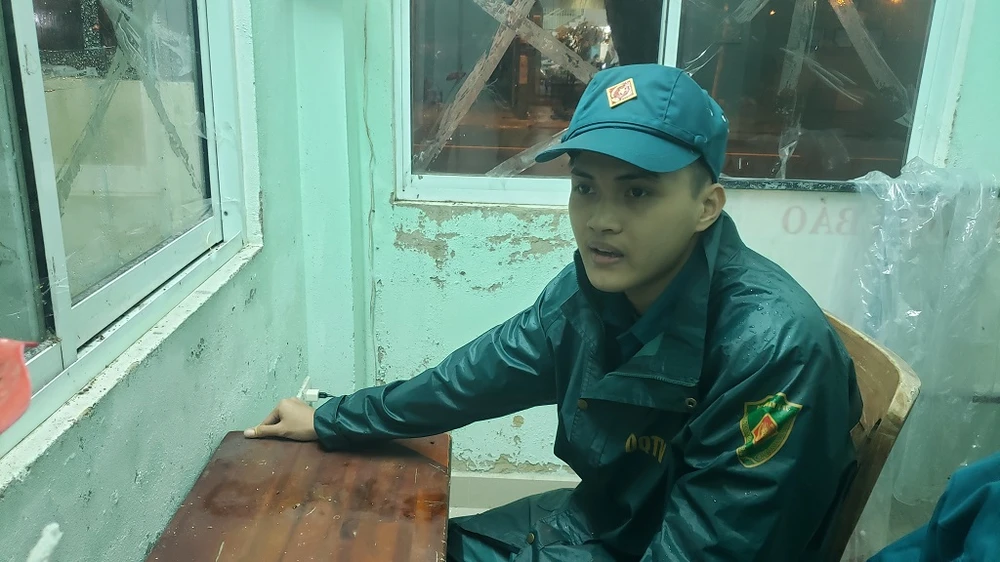Gần 22 giờ, tại Đà Nẵng, mưa đang to dần kèm tiếng gió rít dài. Tại điểm tránh bão tập trung Trường Tiểu học Lê Văn Hiến (phường Hòa Hải, quận Ngũ Hành Sơn), nhiều bà con chưa thể ngủ được vì lo lắng. Họ tập trung ngồi trước cửa phòng để nói chuyện. Ảnh: T.AN