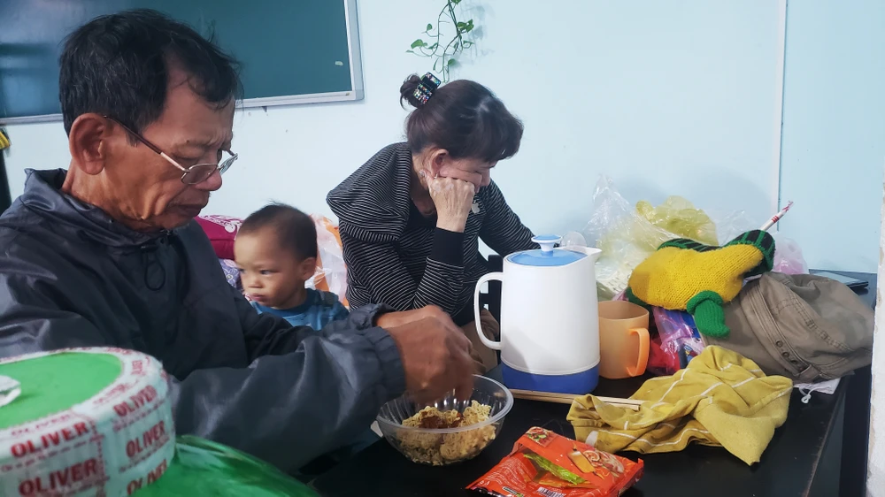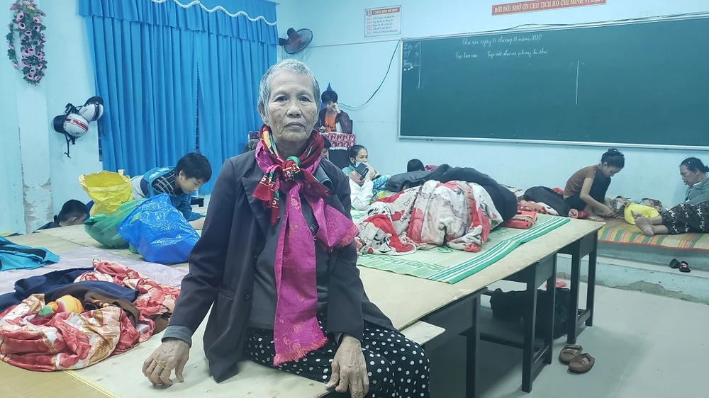 Bà cụ Phạm Thị Tiến (sinh năm 1952) xúc động bảo: "Bà sống một mình nên sáng nay mấy chú công an tới bồng bà lên xe rồi đưa đến đây để tránh bão. Mấy chú còn ưu tiên cho bà nằm giữa cho ấm nữa. Nghĩ mà thương mấy chú ấy, giờ này chắc vân đang "gác bão" cho dân ngủ. Nói thiệt, bà nghe tiếng gió rít mà hãi. Nghe ti vi nói cơn bão ni mạnh lắm, đêm nay bà con lại mất ngủ vì lo". Ảnh: T.AN