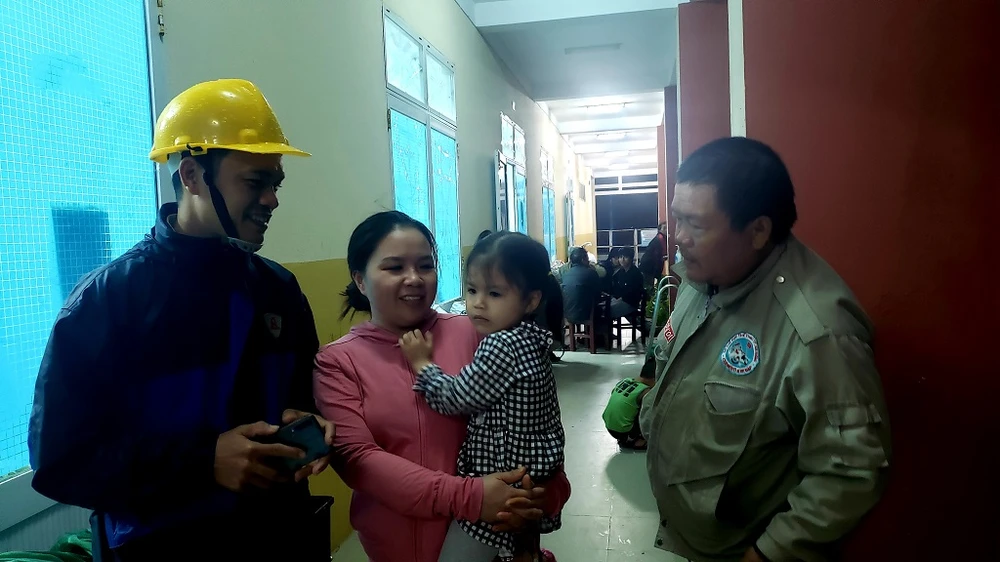 Một người dân hỏi thăm và động viên gia đình anh Phan Thanh Dũng (đội mũ vàng, tổ trưởng tổ 37, phường Hòa Hải). Cả ngày nay, anh Dũng chạy đôn chạy đáo vận động bà con đến nơi an toàn, giờ mới có thời gian gặp vợ và con gái. Ảnh: T.AN