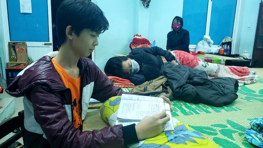 Em Minh Tâm (học sinh lớp 8 Trường THCS Huỳnh Bá Chánh) tranh thủ ngồi ôn lại bài. Em chia sẻ, năm nay học sinh phải nghỉ học nhiều do dịch COVID-19 và bão lũ nên em cảm thấy khá lo lắng."Nghỉ miết, em lo học không kịp chương trình. Đây là lần thứ ba em cùng gia đình đi tránh bão, cũng rất lo lắng, em đã cất kỹ sách vở vào nơi an toàn trước khi cùng mẹ lên đây"- Minh Tâm cho hay.