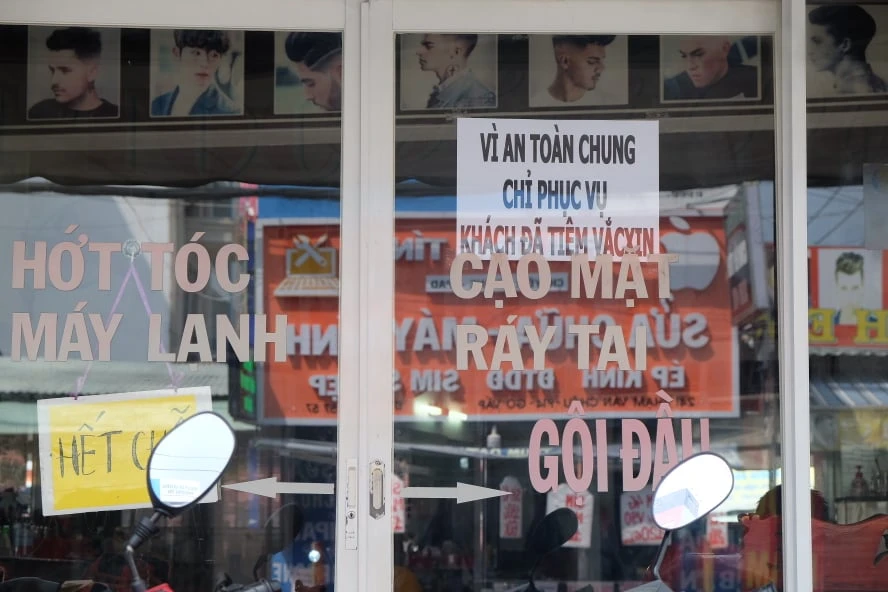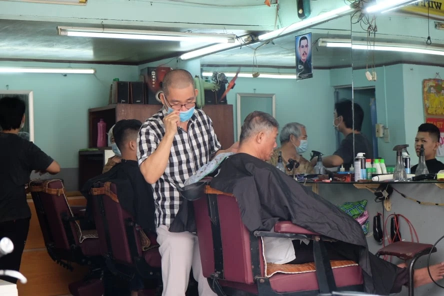 Để an toàn phòng dịch, tiệm hớt tóc chỉ phục vụ khách đã tiêm vắc-xin hoặc khách là F0 đã khỏi bệnh. Ảnh: Thu Hà