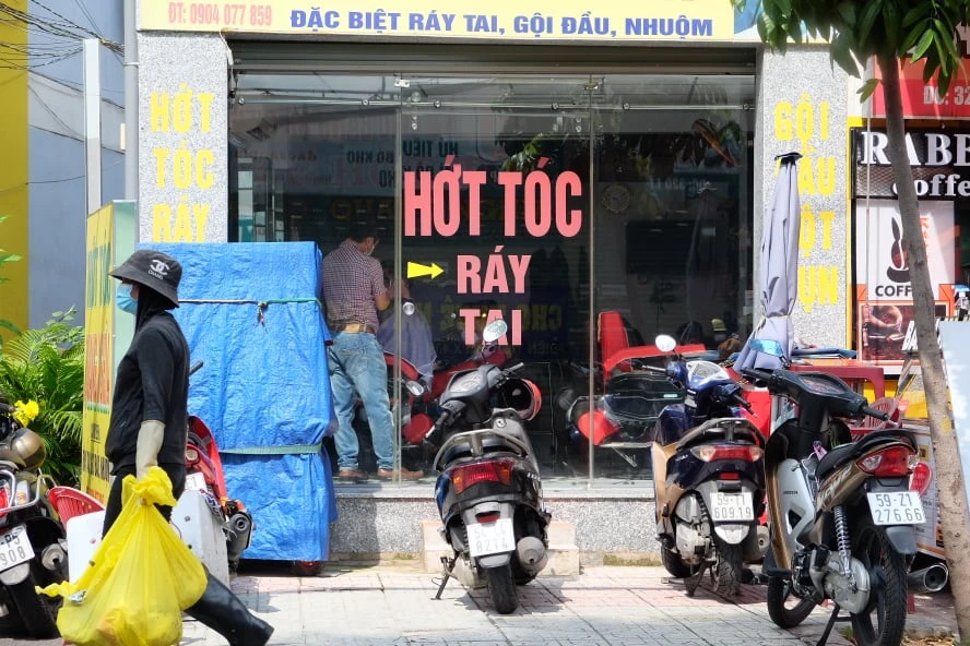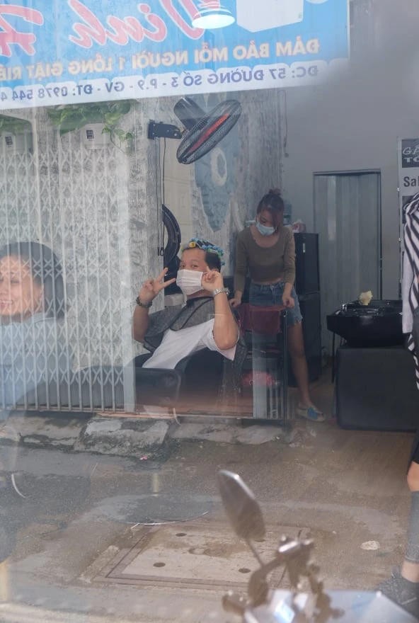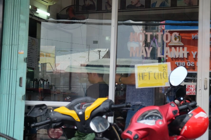 Một salon tóc khác ở đường số 3(Gò Vấp) cũng đã đón khách trở lại sau nhiều tháng đóng cửa. Tuy nhiên salon chỉ nhận khách quen và khách đặt trước để đảm bảo an toàn phòng dịch. Ảnh: Thu Hà
