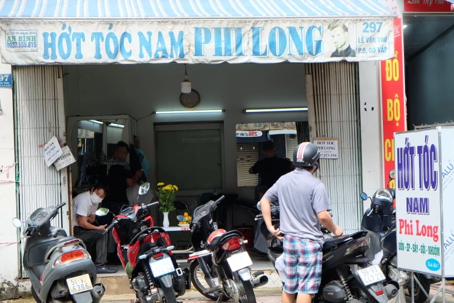 Một tiệm hớt tóc khác trên đường Phạm Văn Chiêu (Gò Vấp) vì chỉ phục vụ 2 khách/lần, nên các khách tới sau sẽ ngồi ở ngoài cửa tiệm để chờ. Ảnh: Thu Hà