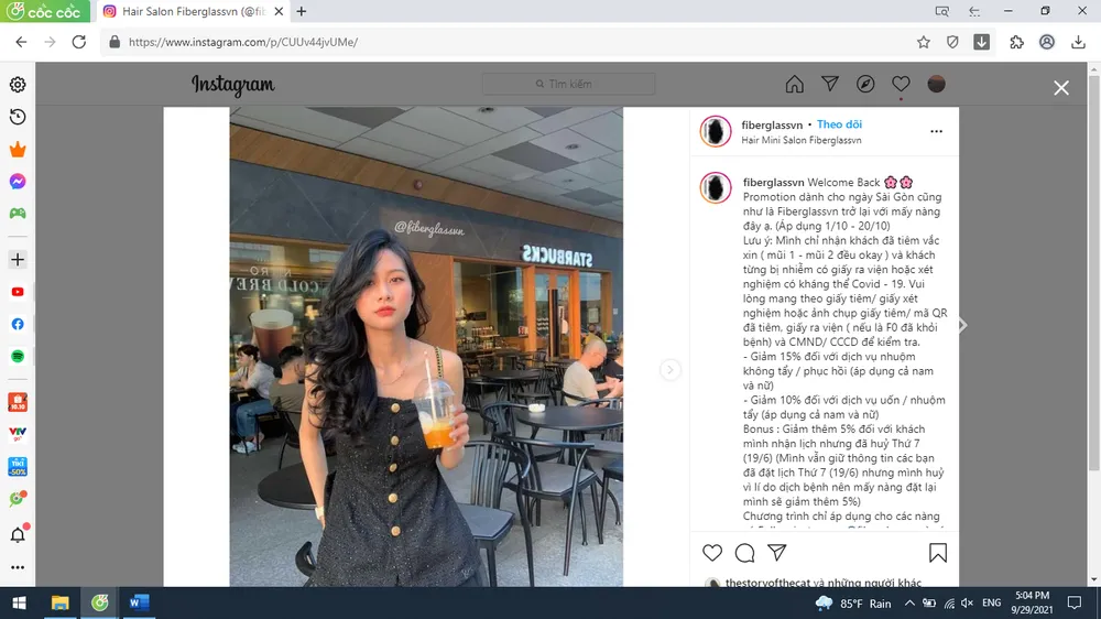 Trong khi đó, thông báo từ Salon Fiberglassvn (quận 1) cho biết tiệm đã nhận khách kín lịch ba ngày từ 1-10 đến 3-10 và đang chờ thông báo chính thức từ UBND TP.