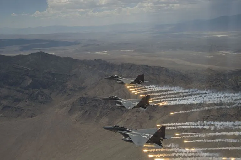 Ba tiêm kích F-15E Strike Eagles của không quân Mỹ bắn pháo sáng tại thao trường Utah năm 2018. Ảnh: AIRMAN 1ST CLASS CODIE TRIMBLE/ U.S. AIR FORCE
