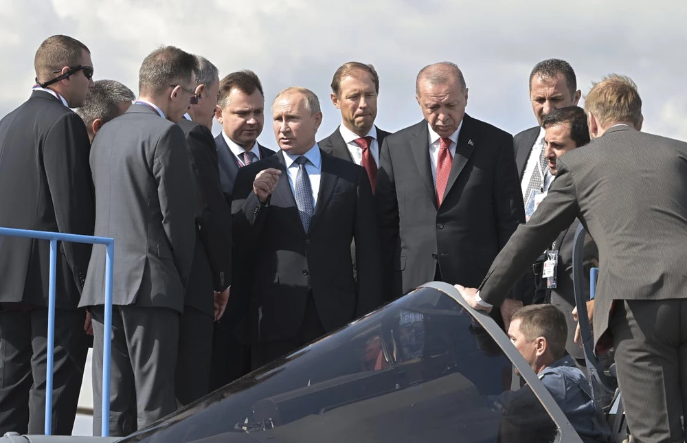 Tổng thống Nga Vladimir Putin (thứ sáu từ phải qua) cùng người đồng cấpThổ Nhĩ Kỳ Recep Tayyip Erdogan (thứ tư từ phải qua) mục sở thị tiêm kích Su-57. Ảnh: SPUTNIK