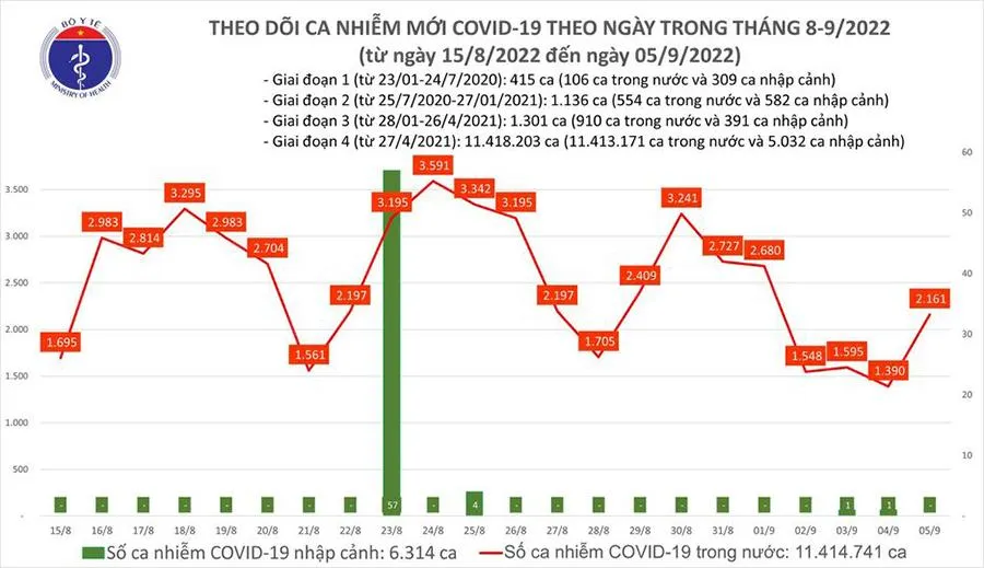 Thống kê từ Bộ Y tế, từ 16 giờ ngày 4-9 đến 16 giờ ngày 5-9, trên hệ thống quốc gia quản lý ca bệnh COVID-19 ghi nhận 2.161 ca mắc, tăng 771 ca nhiễm so với ngày 4-9.