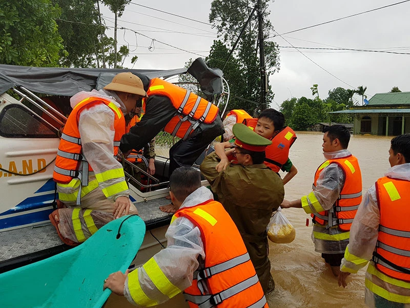 Di chuyển người dân ra khỏi khu vực ngập lũ tại huyện Cam Lộ, Quảng Trị. Ảnh: TTXVN