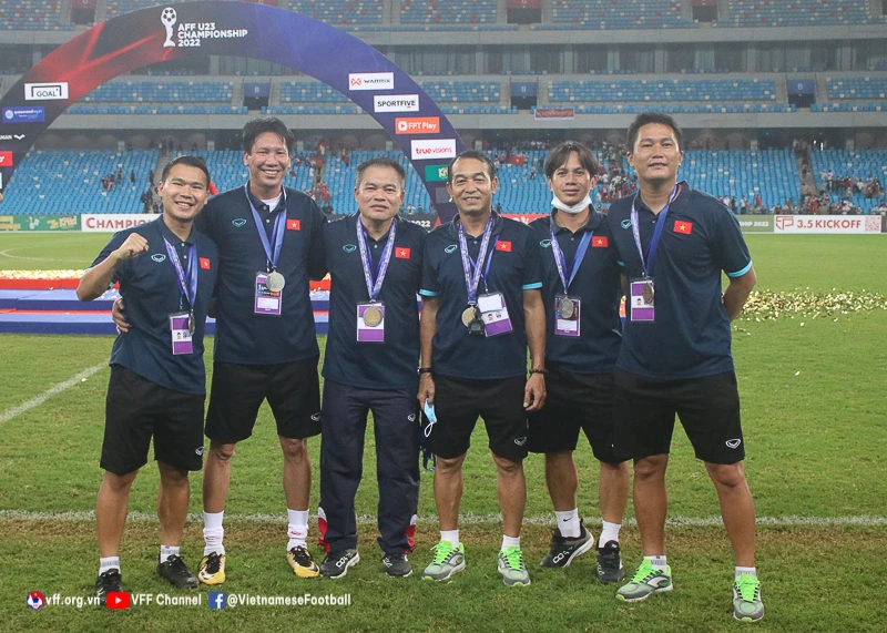 HLV Đinh Thế Nam (thứ ba từ phải qua) và ban huấn luyện U-23 Việt Nam. ẢNH: VFF