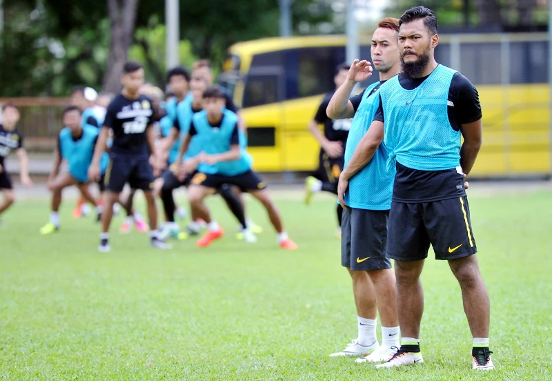 Safee Sali cùng với Talaha trên sân tập. ẢNH: BERNAMA