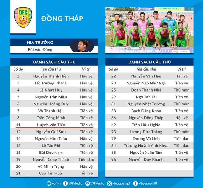 Huỳnh Văn Tiến cùng tám đồng đội nhận án kỷ luật được Đồng Tháp đăng ký thi đấu giải hạng Nhất 2020. ẢNH: VPF