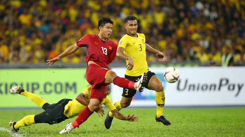 Sumareh gặp khó khăn trước sự truy cản của Đoàn Văn Hậu tại AFF Cup 2018. ẢNH: GETTY IMAGES