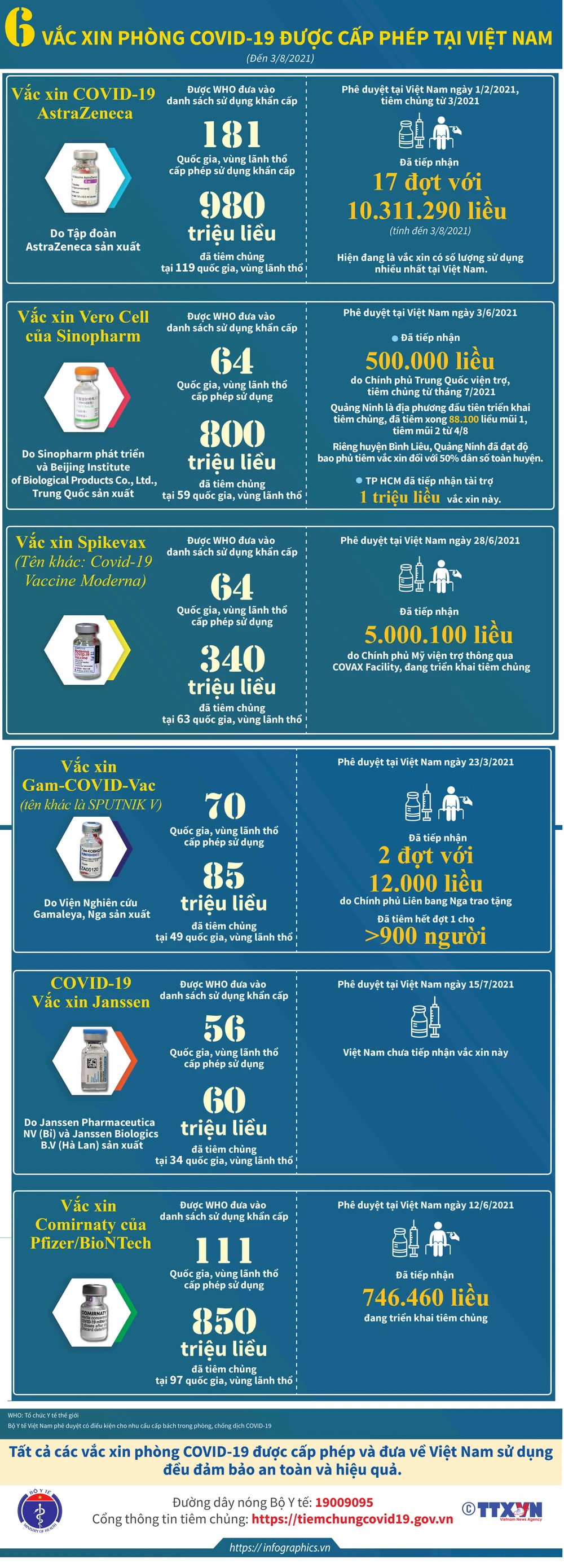 Vaccine COVID-19: Nơi nào tiêm chậm Bộ Y tế sẽ điều chuyển cho nơi khác (PLO)- Dưới đây là nội dung công văn khẩn số 6198 Bộ Y tế và 6 loại vaccine đã được Việt Nam cấp phép (số liều đã được dùng tại các nước).