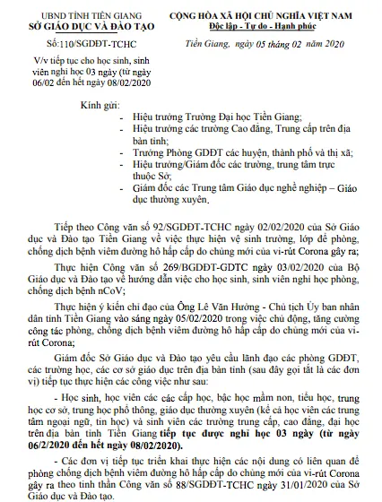 Ngày 5-2, ông Nguyễn Hồng Oanh, Giám đốc Sở GD&ĐT tỉnh Tiền Giang, đã ký ban hành văn bản tiếp tục cho học sinh, sinh viên nghỉ học ba ngày để phòng, chống dịch bệnh viêm đường hô hấp cấp do chủng mới của virus Corona gây ra.