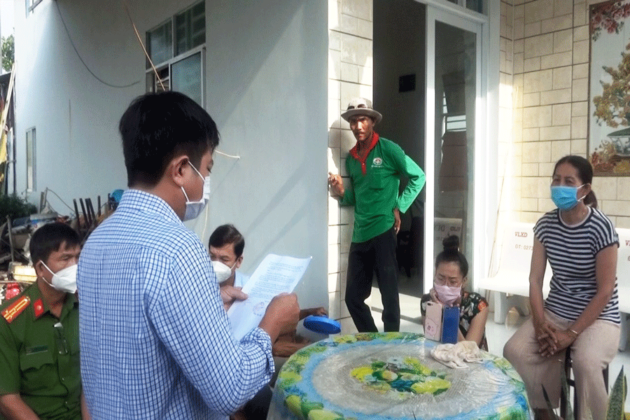 UBND huyện Cái Bè đọc quyết định cưỡng chế, thu hồi đất đối với hộ ông Bùi Văn Thanh. Ảnh: PV