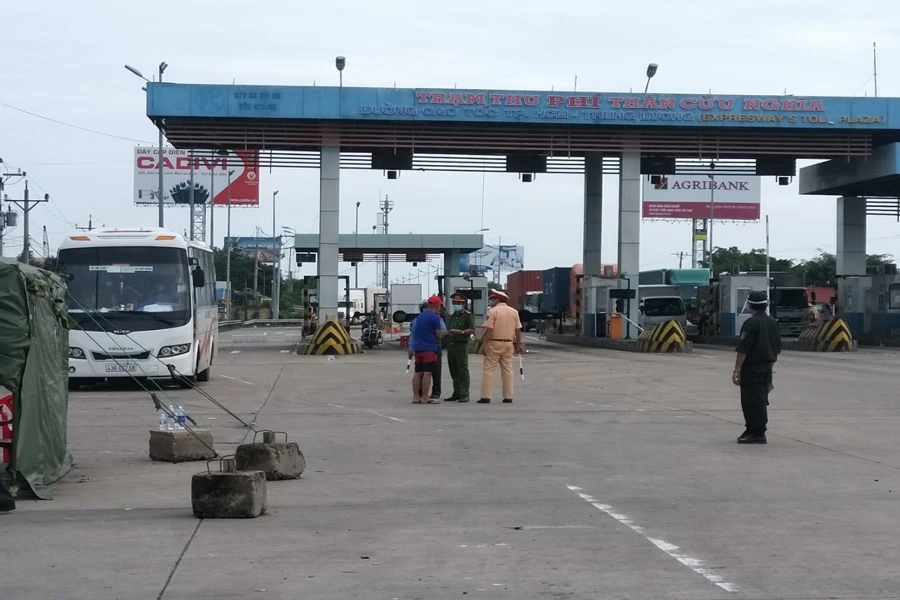 Lực lượng chức năng kiểm soát chặt chẽ người và phương tiện ra vào địa bàn tỉnh Tiền Giang. Ảnh: PV