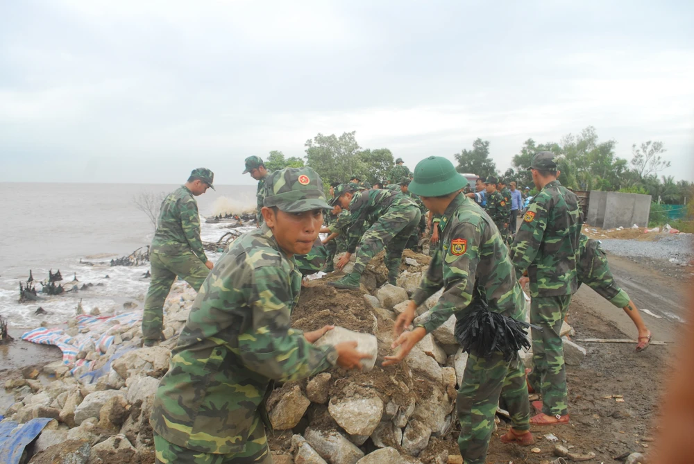 Hình ảnh lực lượng quân sự Tiền Giang có mặt để hộ đê Gò Công, bảo vệ những đoạn đê xung yếu ven biển của tỉnh và kêu gọi dân sơ tán đến nơi an toàn: