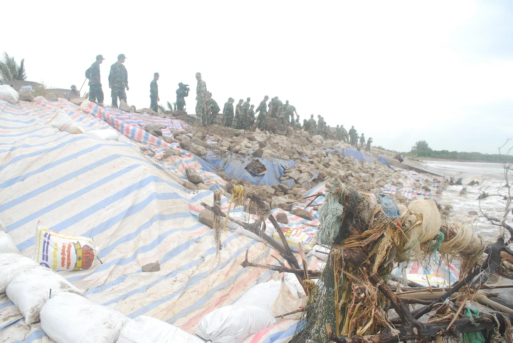 Ban Chỉ huy Phòng, chống thiên tai và Tìm kiếm cứu nạn tỉnh Tiền Giang cho hay đê biển Gò Công dài khoảng 21 km. Trong đó, bốn đoạn dài khoảng 200 m đang bị xâm thực vào tới chân đê. Đây là những điểm xung yếu nhất cần phải bảo vệ khi bão uy hiếp tuyến đê này. Lực lượng quân sự đã dùng bạt trải vào những đoạn bị sạt lở và dùng bao cát và đá dằn lên trên.