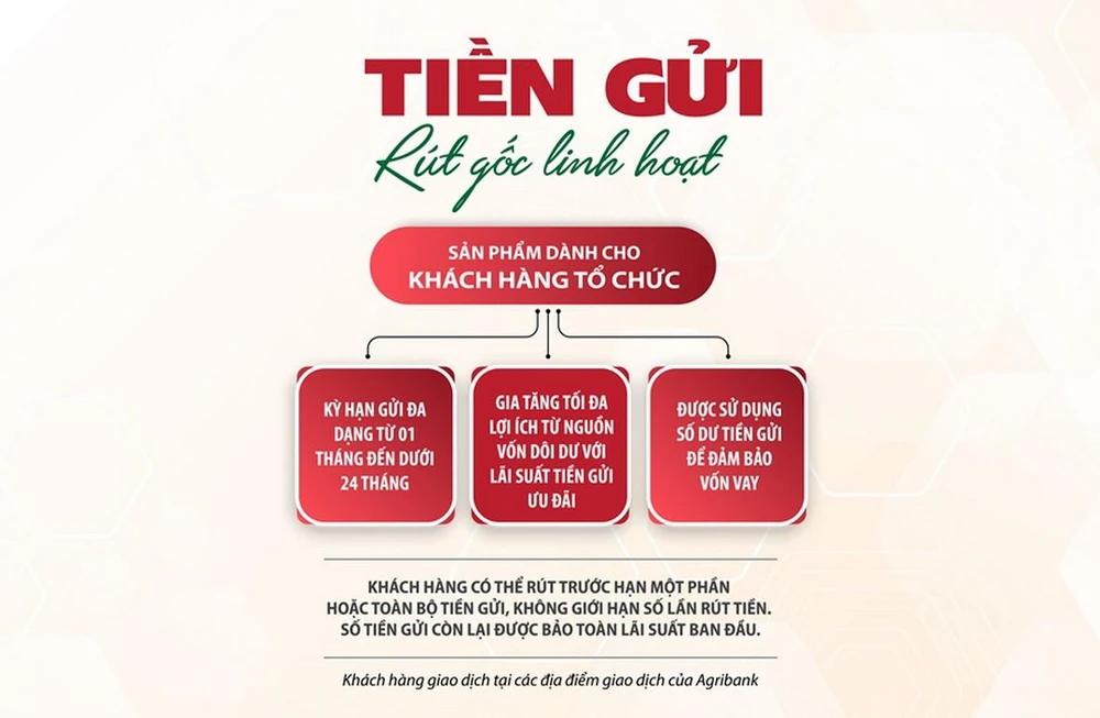 “Tiền gửi rút gốc linh hoạt” của Agribank là sản phẩm tiền gửi có kỳ hạn, theo đó, trong thời hạn gửi tiền, khách hàng có thể rút một phần hoặc toàn bộ số tiền gửi trước ngày đến hạn và được hưởng lãi suất tiền gửi không kỳ hạn tương ứng với thời gian thực gửi và số tiền rút trước hạn. Số tiền gốc còn lại rút đúng hạn được bảo toàn lãi suất ban đầu.