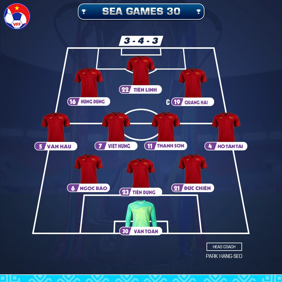 Đội trưởng Quang Hải cũng được ông Park tung ra sân ngay từ đầu thay cho Hoàng Đức. Văn Hậu và Hùng Dũng cũng được đá chính ở trận này.