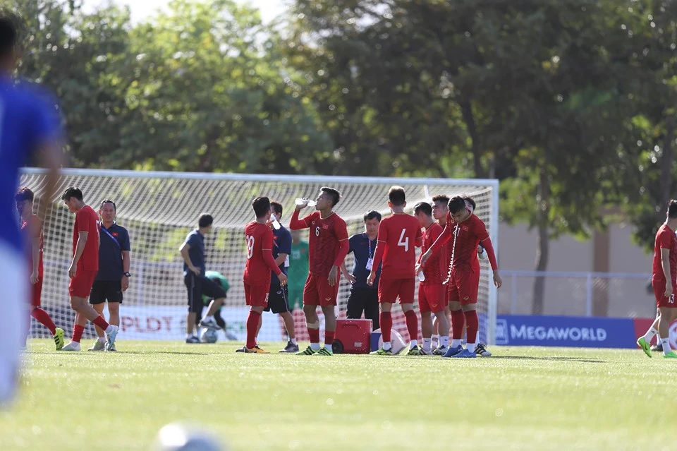 Phút 32, hai đội được tạm nghỉ uống nước do thời tiết ở sân Binan hiện rất nắng nóng.