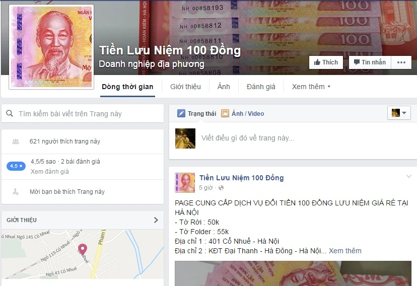 Tại một page có tên “Tiền lưu niệm 100 đồng” mới chỉ được lập trong ngày 15-4 nhưng đã có tới gần 1.000 lượt thích. Page này nhận cung cấp dịch vụ đổi tiền 100 đồng giá rẻ tại Hà Nội với mức giá 50.000 đồng/tờ loại rời và 55.000 đồng/tờ loại folder. Để kích thích người mua, page không quên nhận ship (vận chuyển) hàng trong toàn địa bàn TP Hà Nội, thậm chí là ship miễn phí cho các đơn hàng từ 300.000 đồng trở lên.