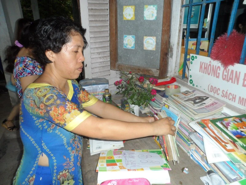 Cô giáo Huỳnh Thị Thanh Phương vừa tranh thủ sắp xếp lại sách báo, vừa liên tục giục: “Mấy đứa vào ăn nhanh không trời tối!”.