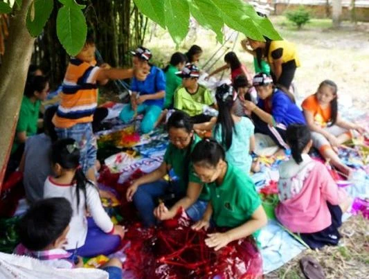 Tay quệt quệt mồ hôi sau một ngày vất vả, Thảo Vy và các bạn đang xúm lại dọn dẹp giấy bóng, quét dọn lại sân. Vài ba bạn được phân công vào dọn cháo lót bụng trước khi trở về TP kẻo trời tối muộn.