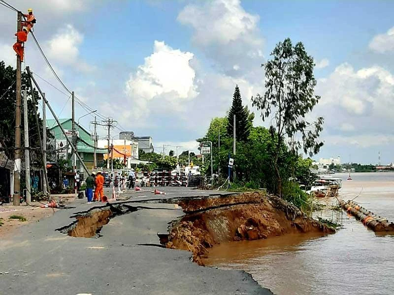 Sau gần một tháng xuất hiện các vết nứt, ngày 20-8, toàn bộ mặt đường quốc lộ (QL) 91 đoạn qua ấp Bình Tân, xã Bình Mỹ, huyện Châu Phú, An Giang đã sụp hoàn toàn xuống sông Hậu.