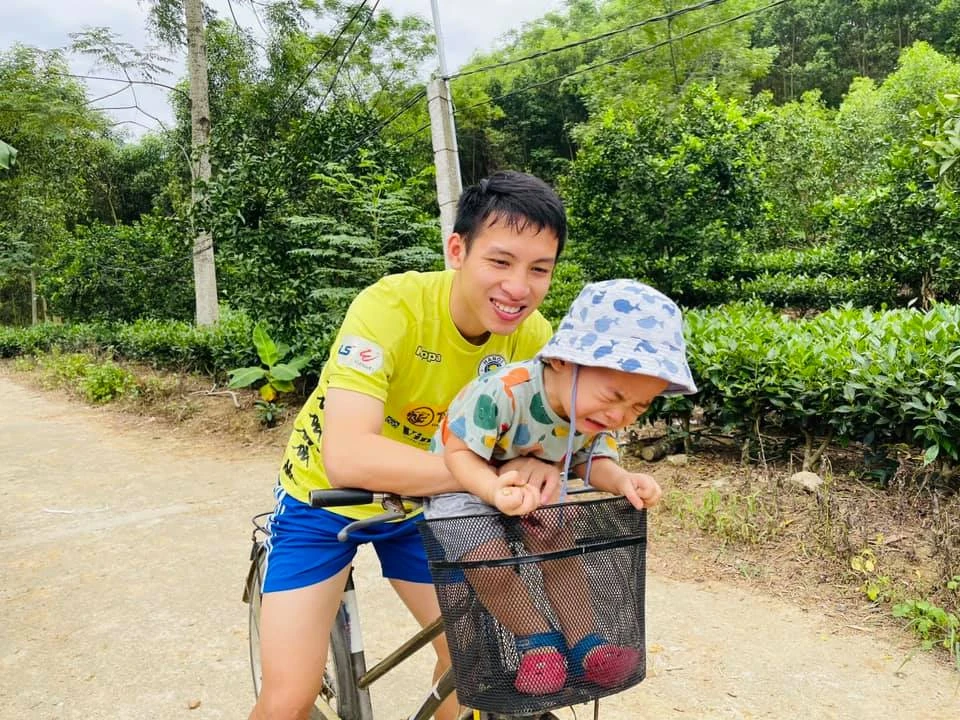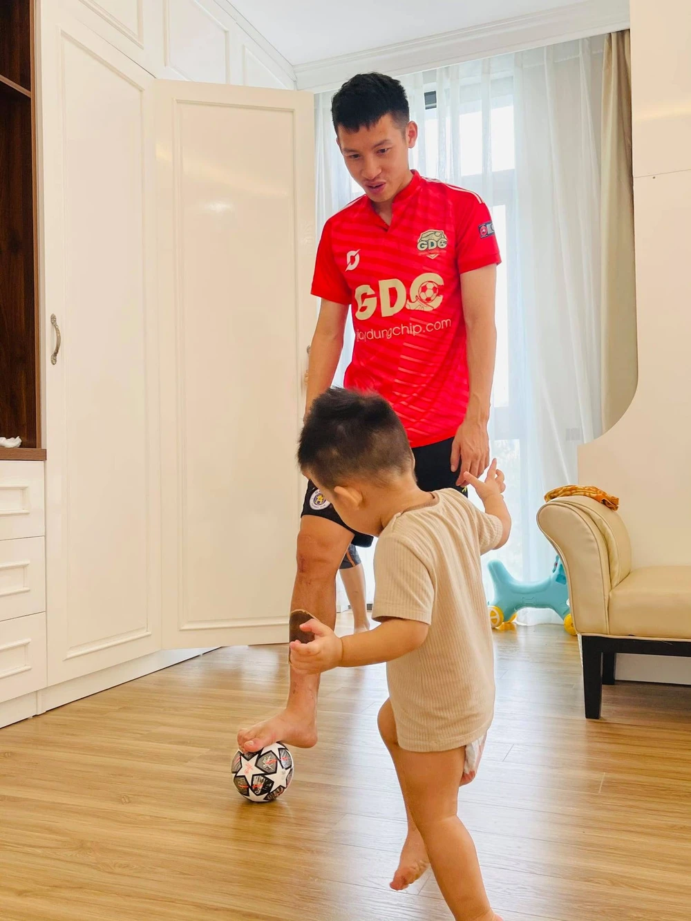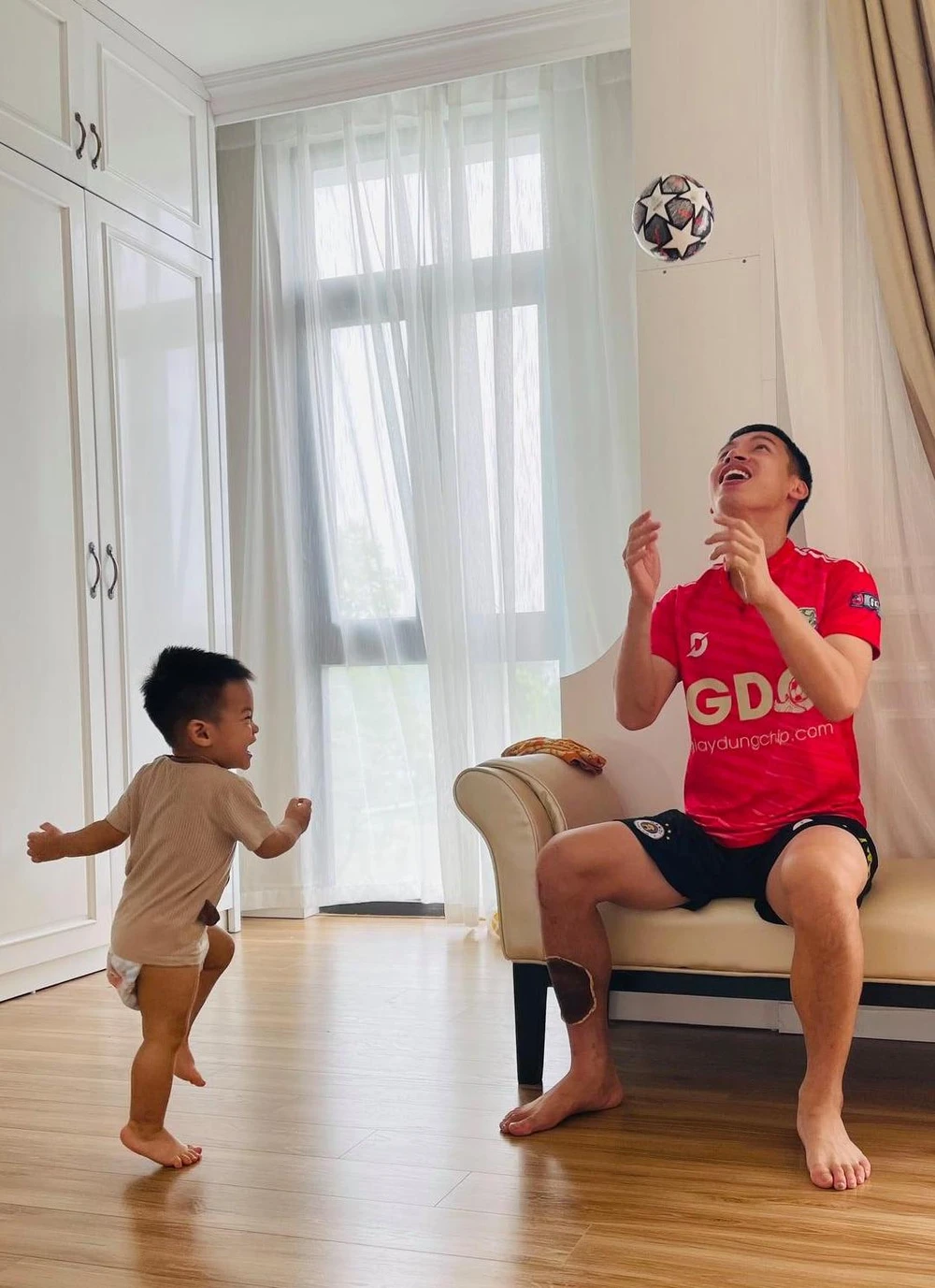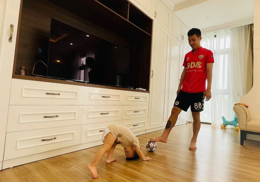 Ở nhà, hai bố con Hùng Dũng trở thành những người đồng đội ăn ý khi cùng nhau tập luyện với trái bóng.