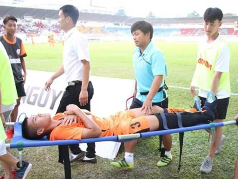 Duy Bảo bị gãy chân tại giải U-19 quốc gia trên sân Pleiku. Ảnh: BTC