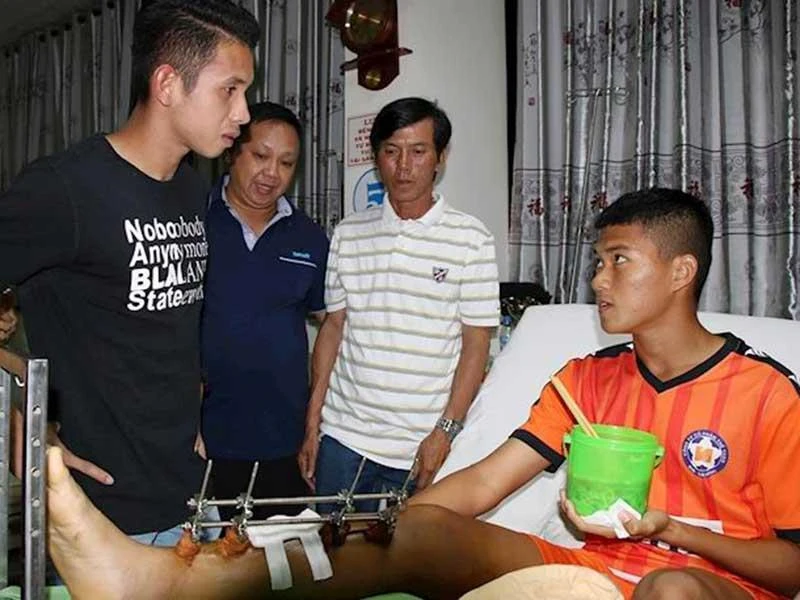 Tuyển thủ Hồng Duy đến bệnh viện thăm hỏi và tặng quà cho đàn em Duy Bảo. Ảnh: SPORT5