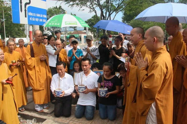 Ba chiếc xe tang dừng lại sát lề. Rất đông người bước xuống. Một đoàn tu sĩ Phật Giáo với áo cà sa màu vàng xếp thành hàng đi đến vị trí. Rồi thì ba bát nhang và 3 di ảnh xếp hàng theo sự chỉ dẫn...