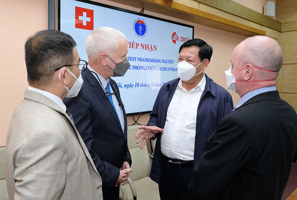 Chiều 10-3, tại Bộ Y tế, Thứ trưởng Đỗ Xuân Tuyên đã tiếp nhận 20.000 bộ xét nghiệm nhanh COVID-19 do công ty DKSH (một Tập đoàn của Thụy Sĩ về Dịch vụ Phát triển Thị trường) tài trợ cho Việt Nam.