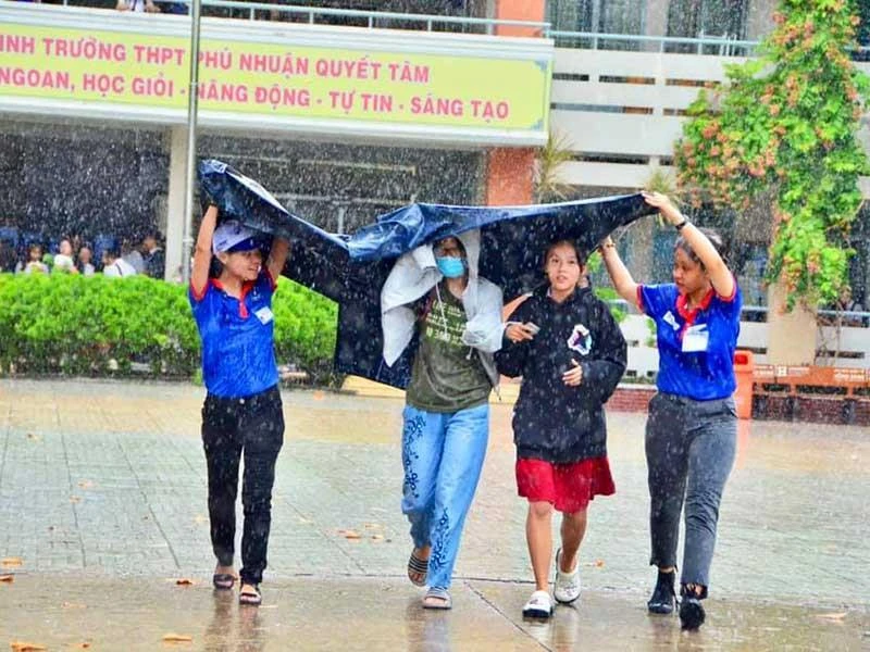 Sau một buổi thi tại Trường THPT Phú Nhuận (TP.HCM), trời bỗng đổ mưa nhưng không nặng hạt. Nhóm sinh viên (SV) tình nguyện tại đây lập tức đứng dậy đi lấy dù và áo mưa chạy vào sân trường để che cho thí sinh (TS) ra về. Nhưng sân trường thật vắng, bởi hầu hết TS đều đứng vào hành lang tranh thủ tám chuyện cùng bạn bè về bài thi, số ít chạy nhanh ra cổng để cha mẹ đón về.