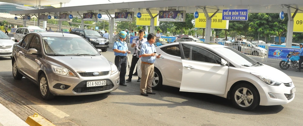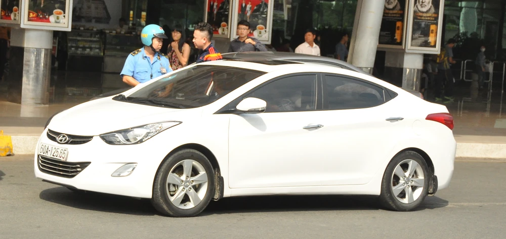 Khoảng 9 giờ 30, chiếc xe Hyundai 60A-125.65 sáng bóng đổ xịch trước nhà ga quốc nội sân bay Tân Sơn Nhất vừa trả khách thì lập tức lực lượng TTGT đề nghị kiểm tra. Hai hành khách trên xe cho biết thông qua ứng dụng Uber đã đón xe này từ Bến Thành đến sân bay Tân Sơn Nhất và trả tiền qua thẻ thanh toán quốc tế.
