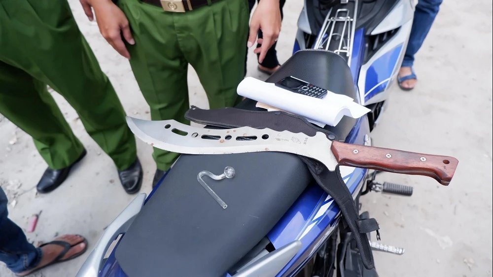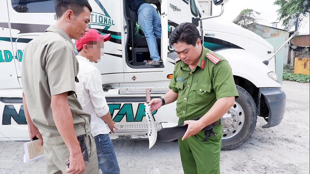 Thu giữ cây đao trên xe tài xế. ẢNH: ĐÀO TRANG.